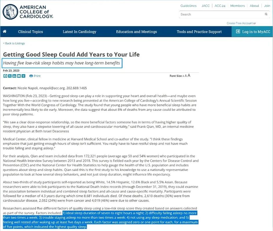 2023年美國心臟病學會(ACC)總結出了5個優質睡眠的“金標準”——