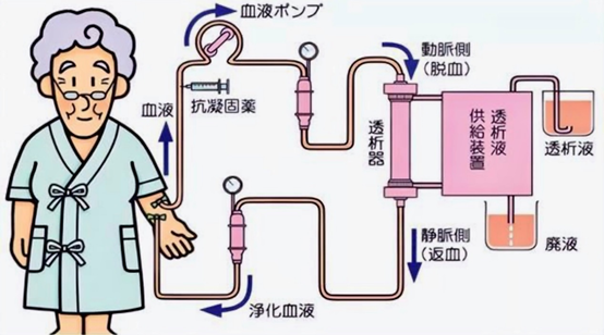 血液透析(hemodialysis, HD)是急慢性腎功能衰竭患者腎臟替代治療方式之一。它通過將體內血液引流至體外,經一個由無數根空心纖維組成的透析器中,血液與含機體濃度相似的電解質溶液(透析液)在一根根空心纖維內外,通過彌散原理進行物質交換,清除體內的代謝廢物、維持電解質和酸堿平衡;同時清除體內過多的水分,并將經過凈化的血液回輸的整個過程稱為血液透析。